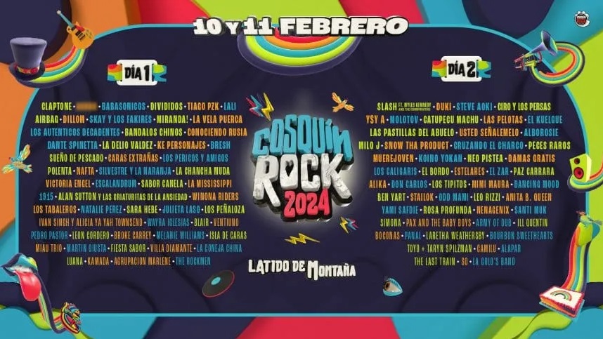 «Serán dos jornadas con más diversidad y pluralismo, abarcando múltiples géneros musicales«, señalaron los organizadores. Así en Santa María de Punilla, Córdoba, se podrá disfrutar de una variedad musical con bandas y artistas de rock, pop, electrónica, trap, reggae, cumbia, tango, jazz, electrónica y blues.